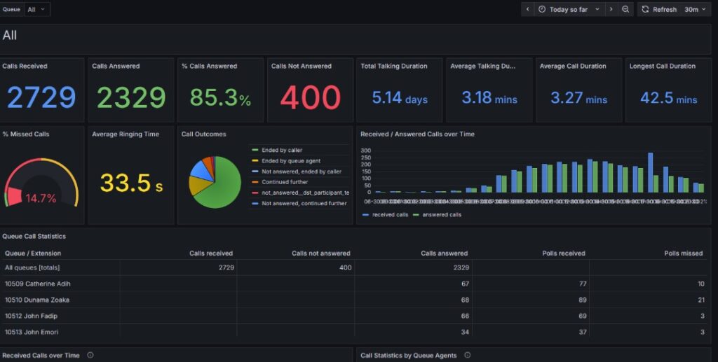 Call Overview – Total calls, trends, answered vs missed